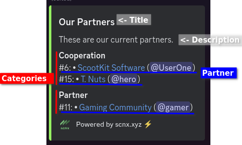 ChannelThis is the channel in which the Partner-List will be sent. If the bot had already sent a message in the past, the old partner list message in that channel will be edited.